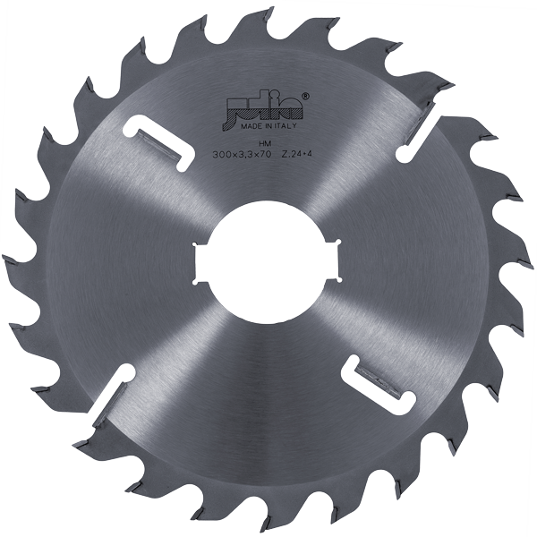 These saw blades have a trapezoidal tooth with positive cutting angle, or hollow tooth with positive or negative cutting angle, to be used with or without scoring blades.
