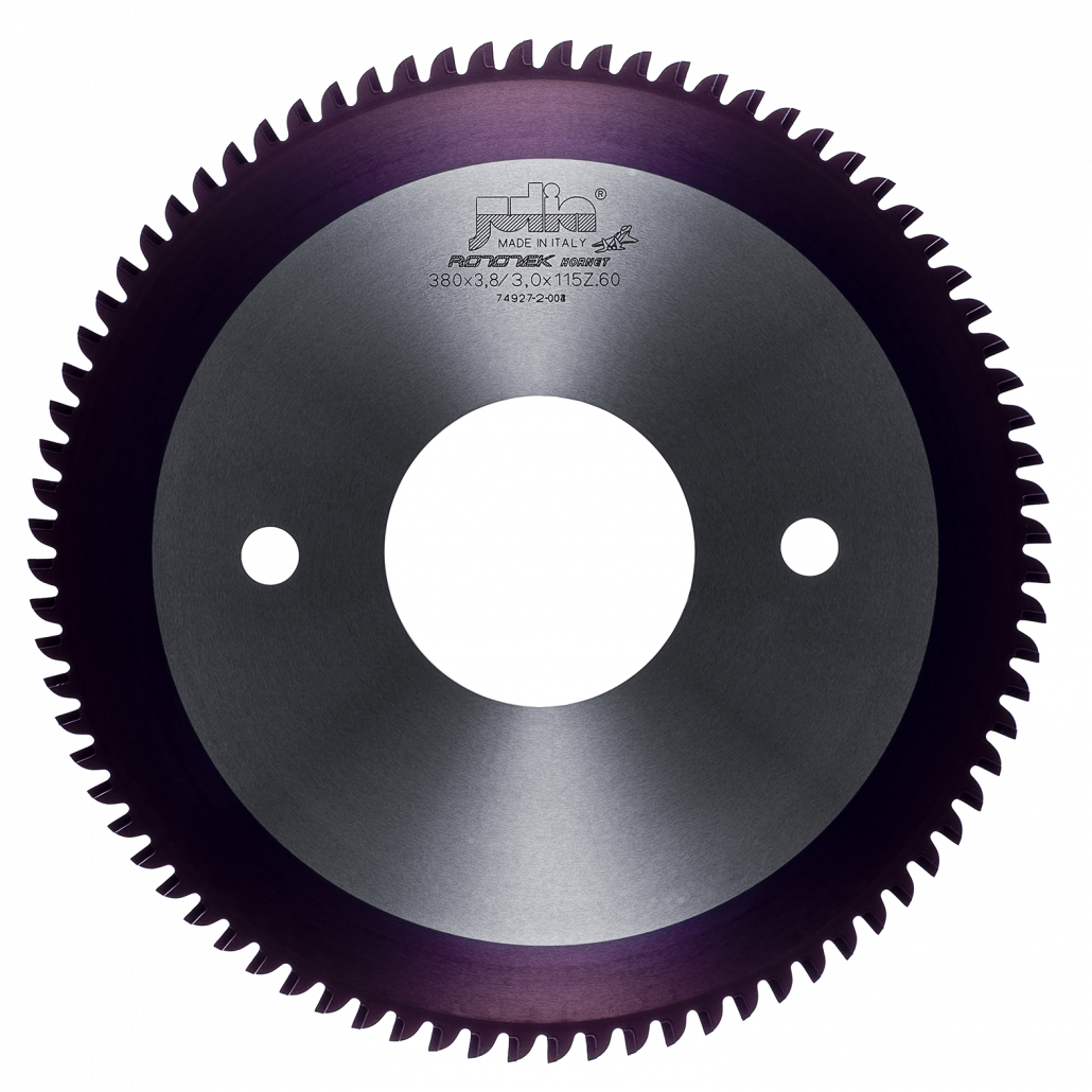 Julia produces a comprehensive range of TCT saw blades in Carbide and Cermet, suitable for every customer application. Hard Metal (HM) is obtained through the synthesizing of tungsten carbide dust, titanium and tantalum, mixed with cobalt dust as a binder. The finely mixed materials are heated to 1500°C and pressed, in order to obtain very thin molecules to form a single homogeneous solid. The main features of HM are to maintain hardness and wear resistance even at the highest operating temperatures developed in the most difficult applications.